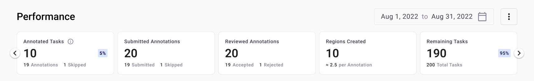 Tasks Pending Review: Remaining tasks that have not been reviewed for annotations submitted during the time period specified. This card also displays the annotation count for annotations submitted but not yet reviewed.