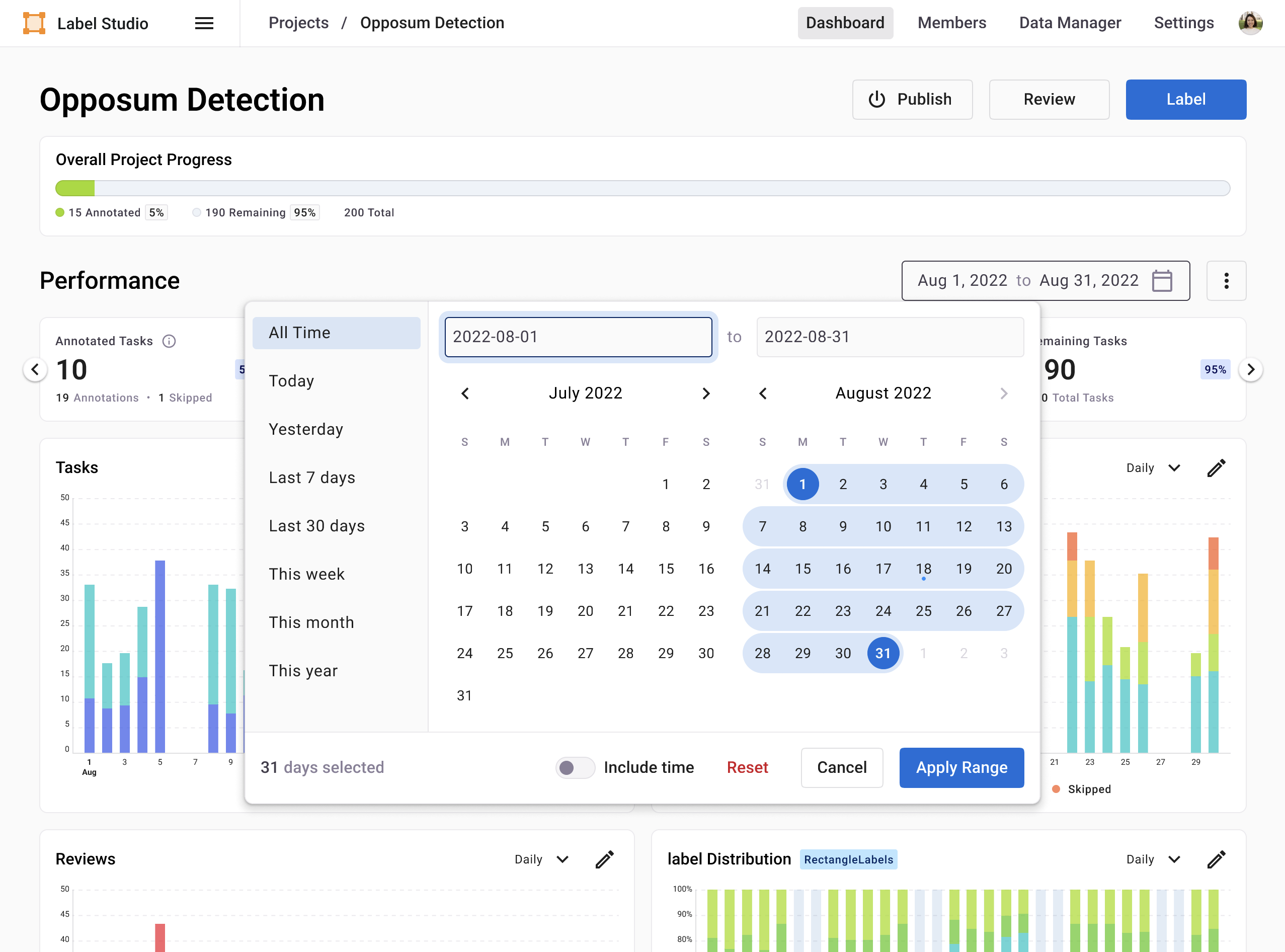 Navigate to your project’s Dashboard tab to discover the project’s progress at a holistic level and use the date time selector to discover trends for key performance indicators such as lead time or submitted annotations and to discover insights through time series charts for tasks, annotations, reviews, and label distributions.