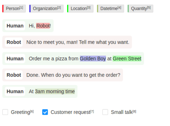 Use this template to provide a section of dialogue, assign labels to spans of text in the dialogue, and classify the intent of the dialogue.